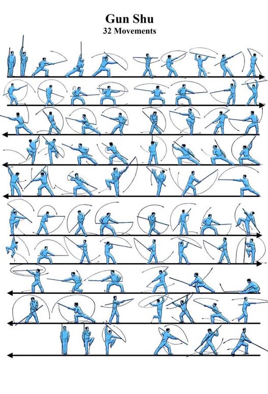 The Gun Shu (32 Forms) is a 32-movement staff routine used in Shaolin Kung Fu and other Chinese martial arts traditions. “Gun” (棍) means staff, and “Shu” (术) means method or technique. So Gun Shu literally means “staff techniques.”